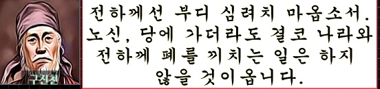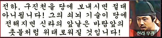 구진천의 굳은 결의와 충성앞에 문무왕은 그를 죽여서라도 결코 당에 보내서는 안된다는 문무 관료들의 간청에도 불구하고 그를 당나라에 보내게 된다.